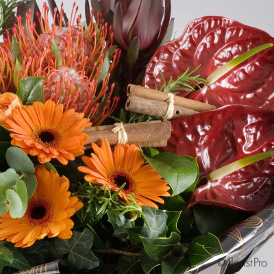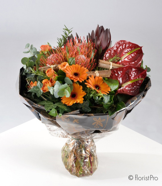 A contemporary hand-tied arrangement of tropical flowers, elegantly gift wrapped.
