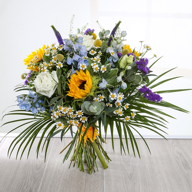 Hermes is designed to brighten that special persons day with exotic tones and textures. This bright bouquet includes Sunflowers, Lisianthus, Thlaspi Bell, Limonium and Palms.