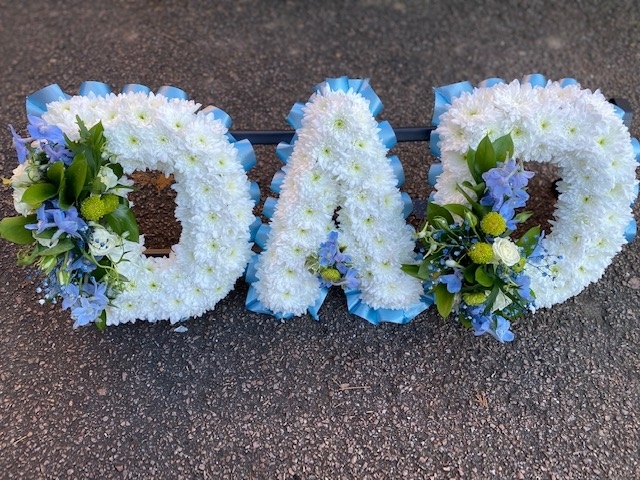 White based with chrysanthemum, ribbon and tip flowers any colour of your choice, please either call us to discuss or add your preference of colours in message column.