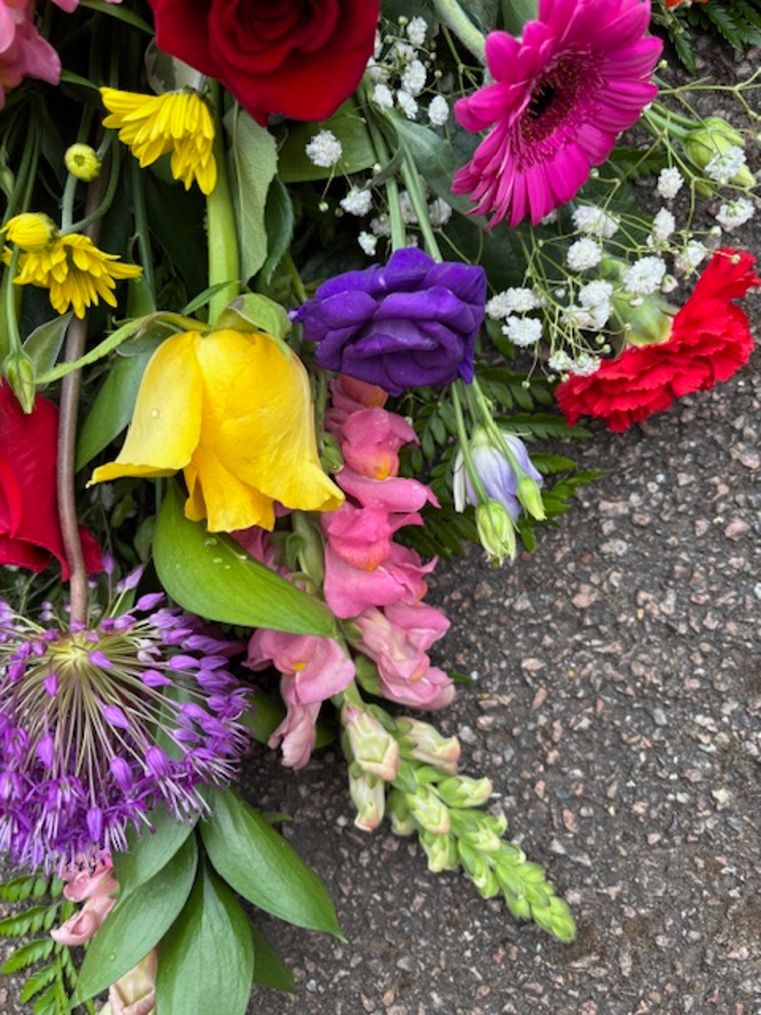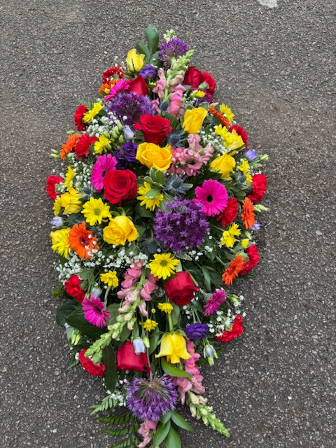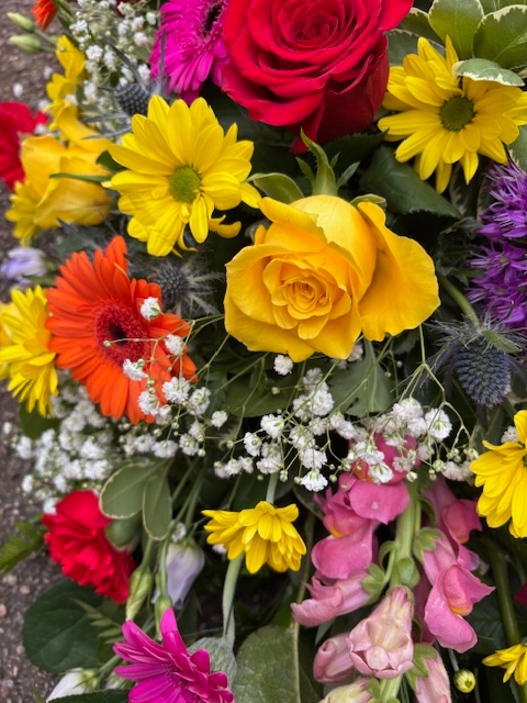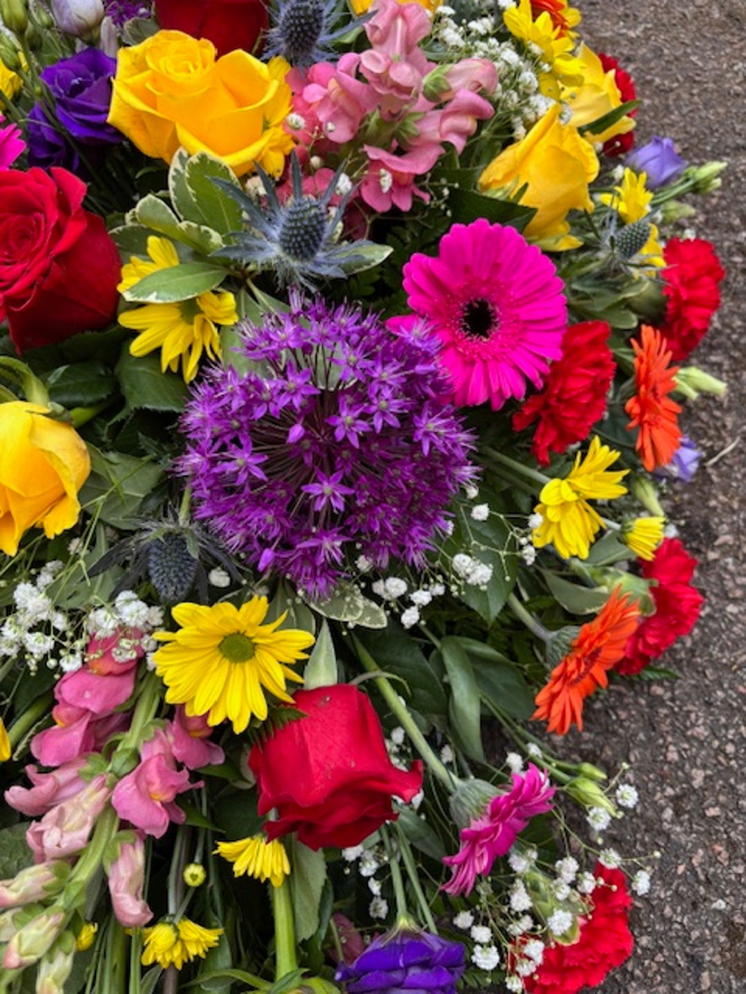 Stunning variation of bright roses, gerbera, allium, matthiola (stock) carnations, chrysanthamums, eryngium completed with foliage and gypsophila.